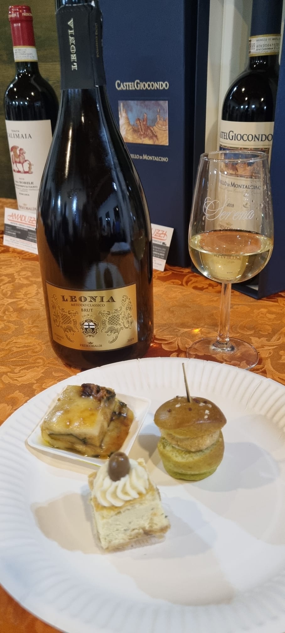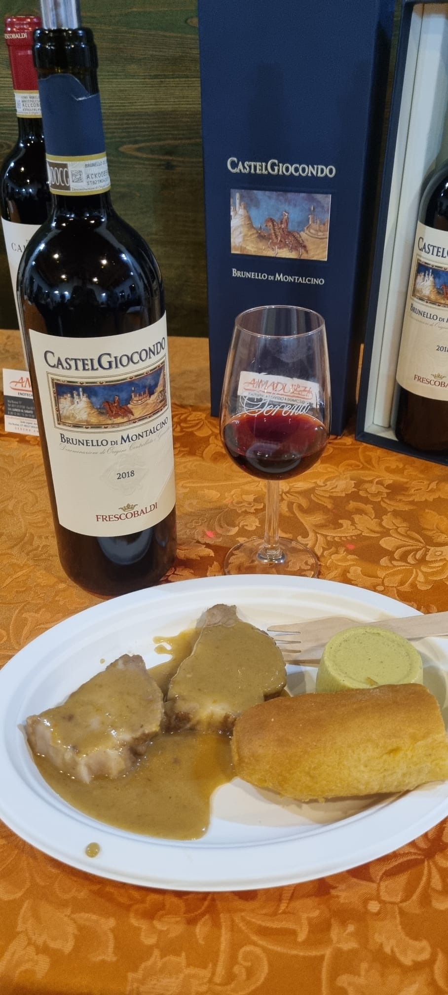 Molto apprezzato l'Olio Laudemio e il vino Catelgiocondo Brunello montalcino annata 2018 abbinato al coppone di maiale ai saponi dell'orto; così come la sorpresa finale con la rara grappa di Nipozzano degustata insieme ai cantucci di Bonci