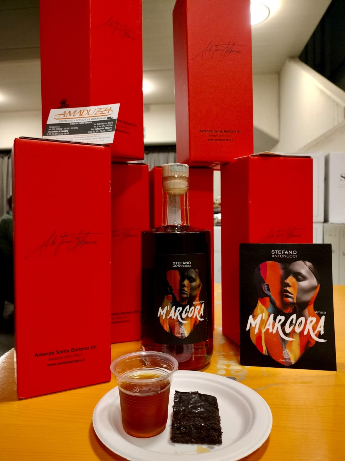 A Serena Amaduzzi piace finire sempre con un dolcino, e quindi perché non far assaggiare l'amaro M'Arcora? Gentilmente corroborante erbaceo a cui è stato messo a fianco un assaggio di torta al cioccolato di Antica Dulcinea che tratta Amaduzzi Enoteche.